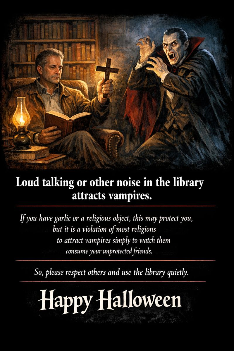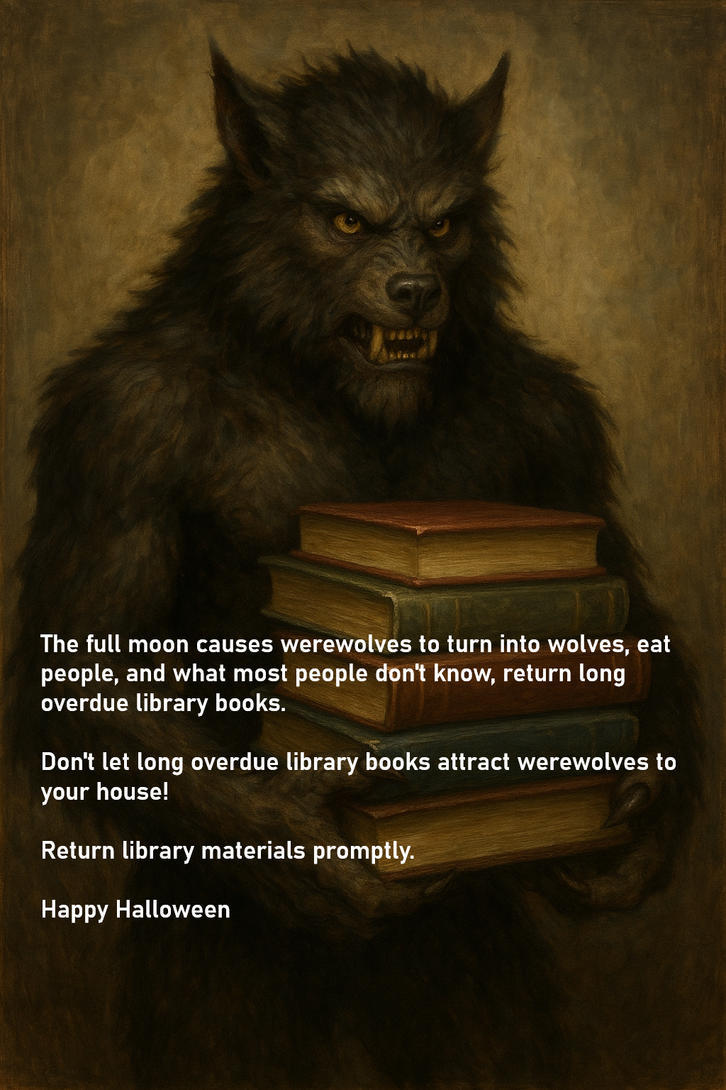I have used Chat GPT to illustrate two of the whimsical Halloween signs to encourage good library behavior. I mentioned above. I simply told Chat GPT to "Create a picture of a werewolf holding books. I added the words by importing the picture into paint.